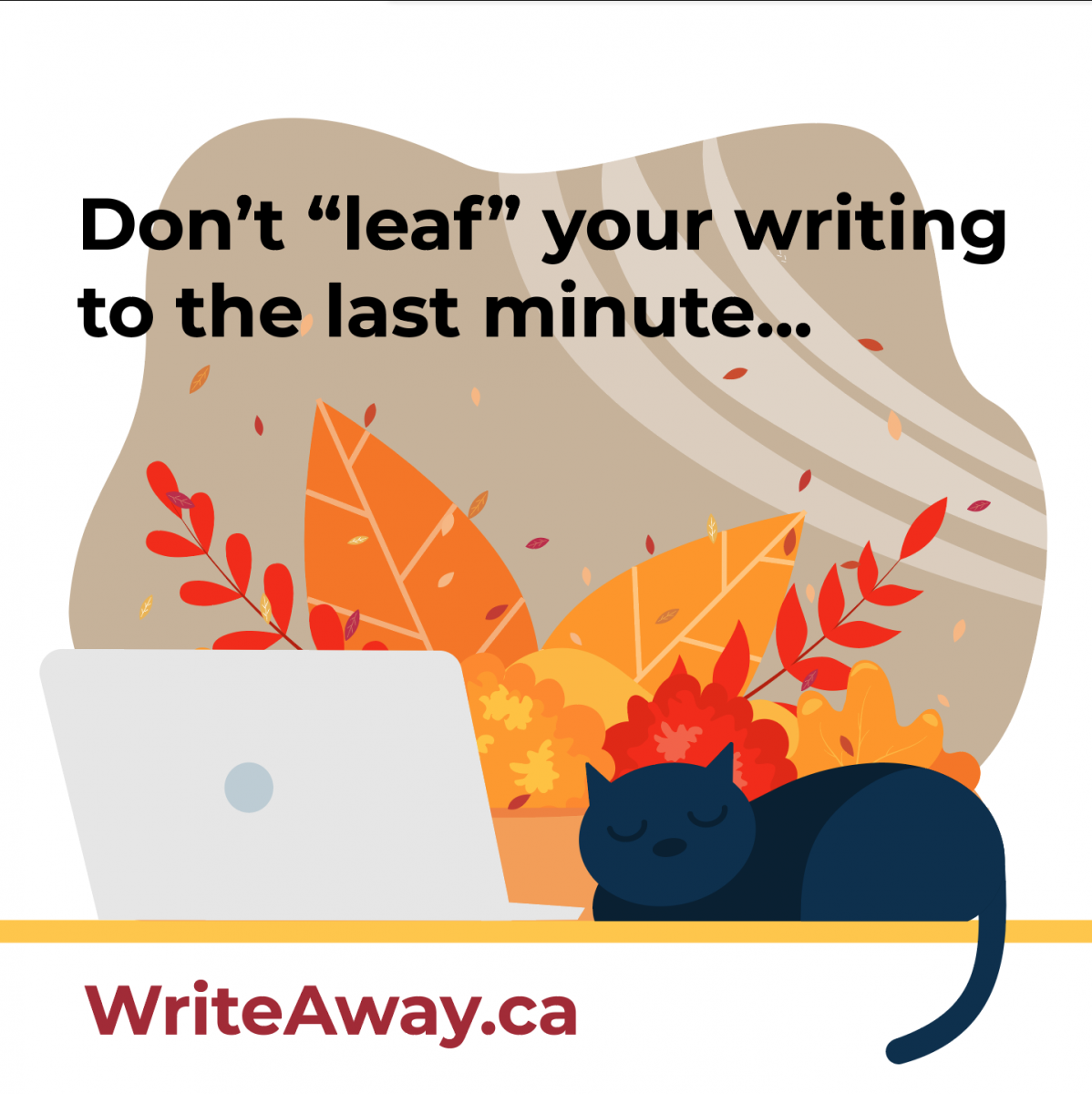 Get your draft paper in early to WriteAway for suggestions from a qualified tutor. The service gets busy at crunch time so don’t delay! Give yourself enough time to make revisions before you need to submit. Visit writeaway.ca to get started.